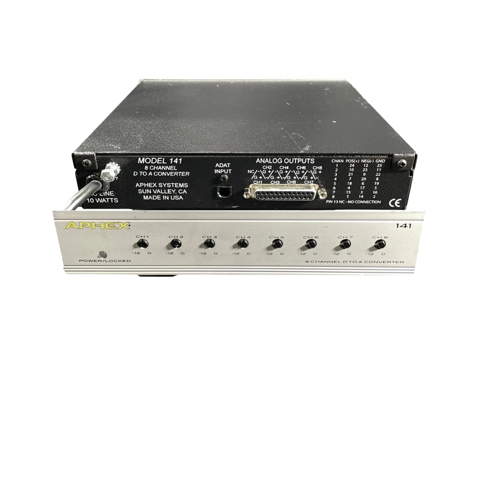 Bring professional-grade audio conversion to your studio with the Aphex 141, an 8-channel ADAT Optical to Analog Converter built for pristine sound quality and reliability. Designed for recording studios, live sound rigs, and broadcast environments, the 141 converts ADAT Lightpipe digital signals into balanced analog outputs with exceptional clarity and low noise.