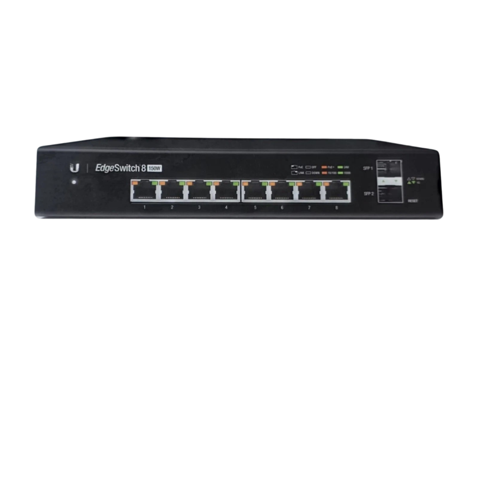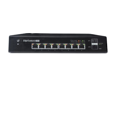 The Ubiquiti ES-8-150W EdgeSwitch is a high-performance managed Gigabit switch designed to deliver reliable switching performance and flexible Power over Ethernet (PoE+) support in a compact form factor. With eight Gigabit Ethernet ports and a total PoE power budget of 150W, this switch is ideal for powering wireless access points, IP cameras, VoIP phones, and other PoE-enabled devices.