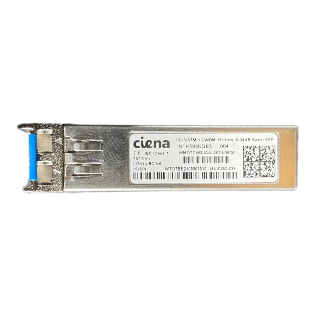 The Ciena NTK592NGE5 is a high-performance 1000BASE-CWDM SFP transceiver designed for reliable long-distance Gigabit Ethernet and OC-3/STM-1 connectivity. Operating at a 1510nm wavelength, it supports transmission up to 40km over single-mode fiber (SMF) with an LC connector, making it an excellent choice for metro networks, enterprise backbones, and service provider environments.